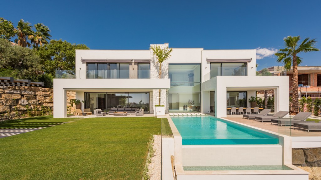 Spectacular 5 bed 5 bath contemporary style villa situated in La Alqueria, one of the most prestigious areas of Benahavis, fully furnisjed with sea views.